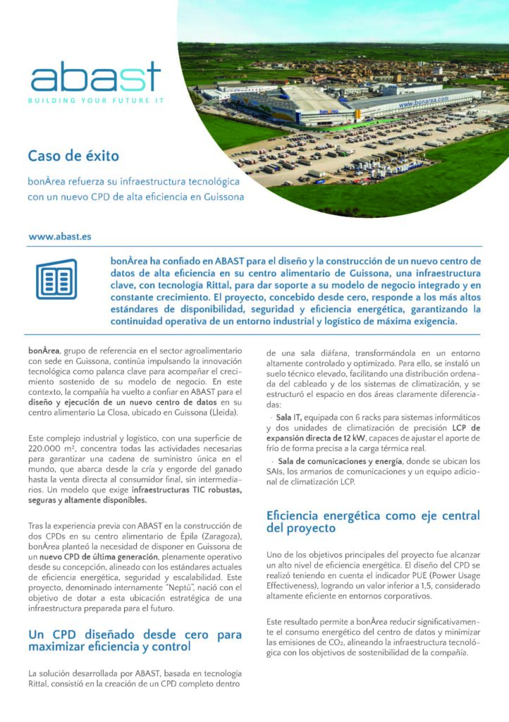 Gracias a este proyecto, bonÀrea dispone ahora en Guissona de un CPD moderno, eficiente y altamente seguro, que refuerza la resiliencia de sus sistemas TIC y acompaña el crecimiento de su actividad industrial y logística. Un nuevo ejemplo del compromiso de ABAST en el diseño e implementación de infraestructuras críticas que aportan valor real al negocio de sus clientes.