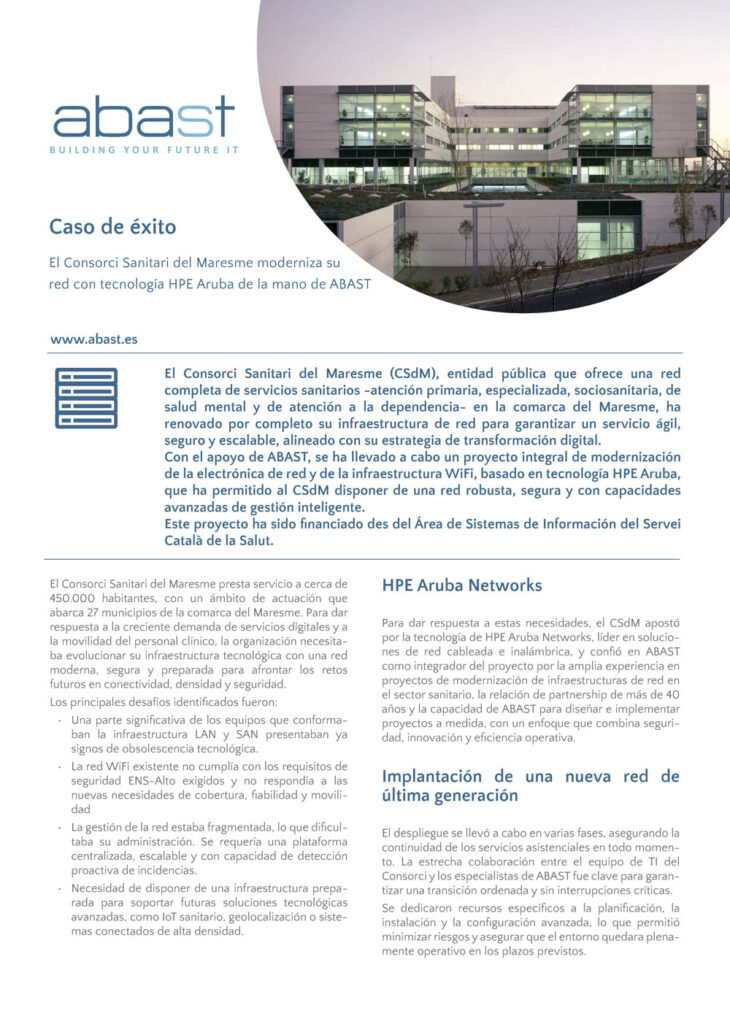 Gracias a su capacitación y a sus alianzas estratégicas con partners como HPE Aruba Networking, ABAST ofrece soluciones seguras, escalables y adaptadas a entornos críticos como el sector sanitario, garantizando conectividad avanzada, movilidad, monitorización inteligente y cumplimiento de estándares de seguridad como el ENS.