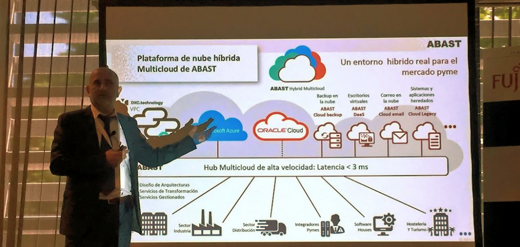 El modelo de ABAST es de “nube híbrida” porque combina servicios de nube privada y de nube pública para aprovechar las ventajas de cada uno de estos modelos, y es “multicloud” porque integra servicios cloud de diferentes proveedores. Entre estos destacan Microsoft, con todos los servicios de Azure, y DXC Technology, que es el nombre de la nueva compañía nacida de la fusión de Hewlett Packard Enterpise Services y CSC, y que tiene la que seguramente es la mejor plataforma de cloud privado virtual del mundo. Pau explicó que dentro de su nube ABAST integra también servicios propios (bakup en la nube, escritorios virtuales, sistemas legacy en cloud…), que integrará en breve también los servicios cloud de Oracle, y seguramente en el futuro otros servicios de otros proveedores.